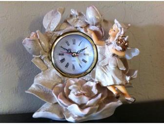 This adorable clock adorned with flowers and an fairy is 6"x6". Perfect for a mantle, bookshelf, or nightstand.