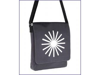The Eames satchel bag features the iconic Eames starburst on the outside. This is a durable, beautiful bag, with an interior zipper and a cotton interior lining featuring Ray Eames small dot textile design. It is coated for water resistance and is big enough to hold a small laptop.