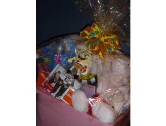 This mega gift basket includes: an iCarly megabyte mic, Mad Libs book, DVD and book; Big Time Rush's debut CD; Spongebob Squarepants Season 5 Volume 1 Discs 1 & 2 DVDs; Spongebob Squarepants silly bands, sticky notes pad and a multiplication book; a Fanboy & Chumchum folder; Nickelodeon logo pencil, notepads and playing cards all in a pink storage bin and topped with a Spongebob Squarepants Beanie Baby.