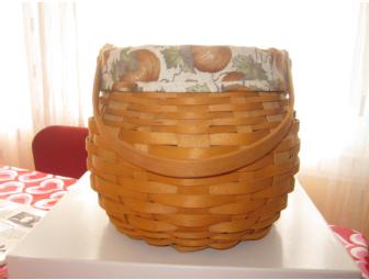 Longaberger Rare and Retired 2001 PUMPKIN PATCH BASKET SET to include: The Basket ( measuring 6.5" x 6.75" High ) with Gorgeous Barrel Design, Hard Board Bottom and one swinging handle , the gorgeous Pumpkin fabric liner with over the edge STstyle and button closures at the handle side and plastic protector