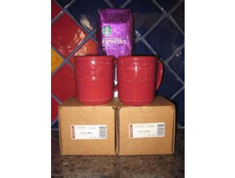 This is a set of two Logaverger Woven Traditional Mugs in Paprika color, new with boxes, and one pound of Starbucks coffee beans!