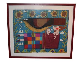 Chris Antieu works in "fabric pictures", or textile appliquè, which she creates by cutting fabric shapes and sewing them to a fabric background. The swatches of material she buys at fabric stores, thrift shops, and old fashioned five-and-dimes are her palette. The sewing machine is her drawing tool - She uses it to scribble color with tiny stiches. Many of her pieces are finished with hand-stiched embroidery techniques. All of her pieces are presented under glass, in hand-painted frames, which are individually created for each piece. Professionally framed in red.