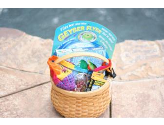 Basket includes fling sock toys, waterproof playing cards, pool thermometer, geyser flyer, blow-up swim frog, gift pack of spa scense