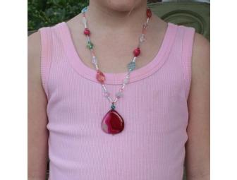This beautiful necklace is 18" long and features glass beads, a copper clasp and a dyed agate pendant. Handmade by Munford Mom Liz Simmers! See the rest of her works of art here: http://www.etsy.com/shop/AlabasterArts
