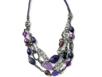 Purple suede cord merges with a grapevine of silver and hematite chain bearing a fresh crop of glass cat’s eye with glass and resin beads.