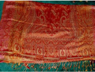 New 70% cashmere and 30% silk shawl from India. Fabulous quality. It is very fine, and the design is like 19th century paisleys, very intricate. It is 28 inches by 72 inches and can be washed in cold water with shampoo.