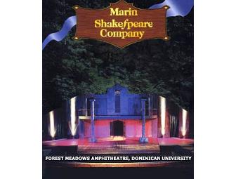 A certificate for two tickets to any performance in the 2012 summer season of the Marin Shakespeare Company. Performances include "King John", "A Midsummer Night's Dream", and "The Liar" all performed at the Forest Meadows Amphitheatre.