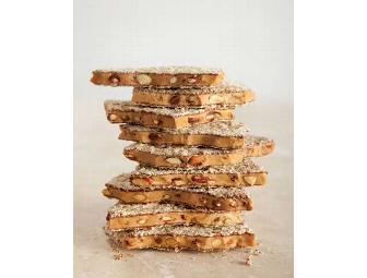 Winner entitled to two lbs. of bittersweet chocolate almost toffee (Belgian chocolate), butter, sugar, sliced almonds. (Refrigerates very well sealed for up to 4 weeks). Two pounds total and half may be ordered at a time. Will be delivered to BHDS (SF) into 4 half pound gift bags.