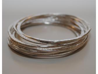 This gorgeous set of nine sterling silver, hand-formed bangles was created exclusively for this event by Jody Stokes of Eugene Oregon. Organic in shape, each bracelet is hand cut, formed, soldered (cadmium free) and rolled. The artist etches patterns into recycled brass sheets, and uses a rolling mill to transfer the pattern to each sterling bracelet, made of sterling. Jody Stokes signs each unique piece and the etching plates have been destroyed, therefore, the bracelets will always be, one of a kind! The artist has also left one bracelet blank and she will personalize it for you!