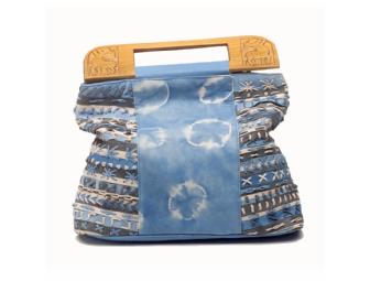 This gorgeous handbag, named Ibex, is from Konjo Ababa. Intricate hand carved wooden handles top this brilliant style. Hand stitched leather detailing provides a flare of color while a delicate tie-dye pattern brings simplicity. You can experience the harmonious combination of intricacy and simplicity from this beautiful wearable art.