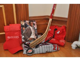 Delight the sports fan in your family with this unique sports package including hockey puck signed by NJ Devils Defenseman Matt Taorima, autographed photo of Nets coach Avery Johnson, Easton Synergy youth hockey stick, mouthguard, assorted hockey accessories, sports cap, insulated lunch bags, whistle lanyards.