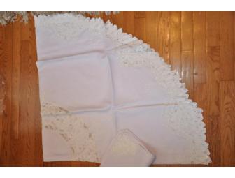 Beautiful 68" round white tablecloth edged with lace and enhanced with a light pattern will be sure to compliment your Shabbat table.