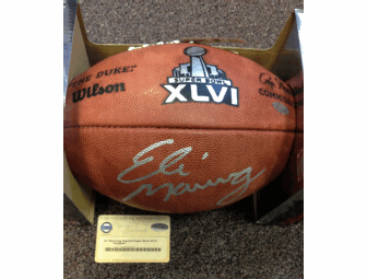Football autographed by New York Giants Quarterback Eli Manning. Manning won the Most Valuable Player award in Super Bowl XLII in 2008 after leading the Giants to victory over the previously undefeated New England Patriots. On February 5, 2012 he again led his team to victory in Super Bowl XLVI, a rematch with the Patriots, in which Manning again won MVP honors and also set a new Super Bowl record with nine consecutive completions to start the game. Manning is one of five quarterbacks who have won multiple Super Bowl MVP awards.