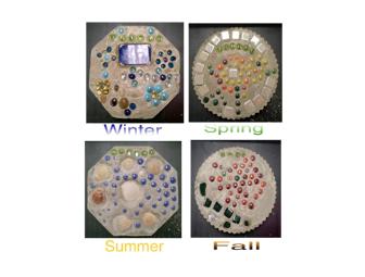 This auction item is for Garden Art created by Mrs. Creedon's Kindergarten class. The Budding Artists in Room 21 hand designed each piece. This is Cooperative Art and the children split up into 4 groups to design a Season in a Stepping Stone. The end results are colorful and unique ! ! This is mixed media using colored glass, tile, shells, rocks inlaid in cement. Each piece is signed and numbered. Hold onto these pieces for 20 years and you just might have a Famous Artist(s) signature ! ! Thanks for Bidding !