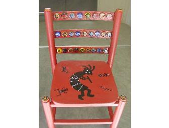 Child size chair with wonderful Native American designs painted on it with bottle cap decorative additions, perfect for decorating a sitting or sun room!