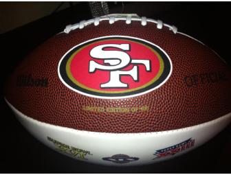 This collectors item is a commemorative San Francisco 49er football signed by head coach Jim Harbaugh during the 2011 season. It is also decorated with the five Superbowl logos which the 49ers have won through the years.