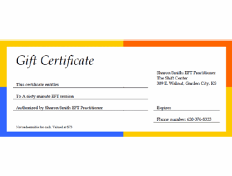 A sixty minute EFT session with Sharon Smith, a practitioner of Emotional Freedom Techniques...A $75 value and is valid for six months from issue date of 3/20/2012.