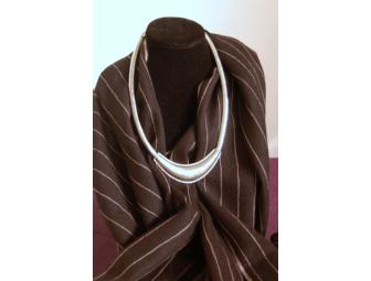 The perfect cover up for cool weather, this beautiful wrap is dark brown with yellow pinstripes in a blend of 70% Cashmere and 30% Silk. Complete the look with silver ribbed collar necklace and matching earrings from Monet. Necklace features a flexible silver chain, a brush textured pendant with filigree detail and lobster claw fastening; measures 17".