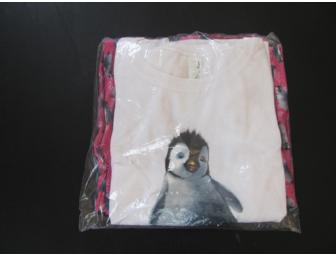 A NEW pair of pajamas showing the main penguin from Happy Feet Two. Pink pants, white t-shirt, size L (10/12).