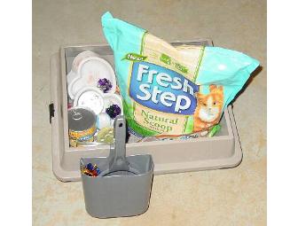 1 sifting litter box, 1 bag Fresh Scent litter, litter scooper and holder, assorted cat toys, assorted canned cat food, 2 pink heart cat dishes and more!