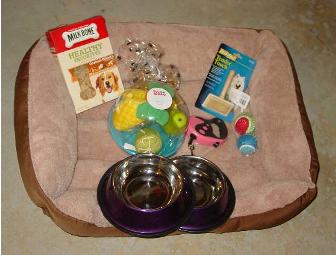 1 large plush dog bed, 2 stainless steel purple dog dishes, 2 tennis balls, Milk Bones, Retractable leash, Frisbee and toys, dog brush + additional food and toys!