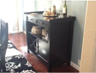 Pottery Barn Black Buffet - 42"W x 22"D x 38 ½”H. Two drawers, wine storage, one big cabinet, wide open storage. This Buffet is in good shape with only minor imperfections from being a few years old.