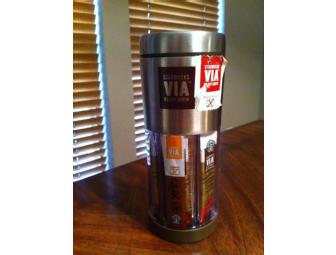 This 10-oz. tumbler includes 6 individual packets of VIA Ready Brew packets (3 French Roast Extra Bold and 3 Italian Roast Extra Bold).