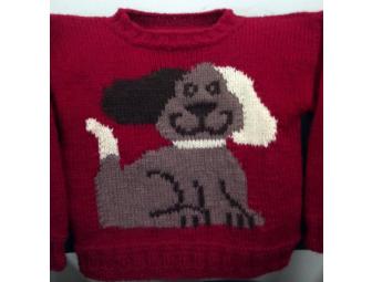 Whimsical hand knit sweater features a puppy for everyone's smiles. Easy care, machine wash and dry at low tem settings. Wool blend.