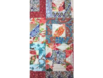Beuatiful hand quilted reversible table runner. 100% washed cotton, polyester batting (fusible for stability). One side is a square-in-a-square pieced top from assorted oriental fabrics. The other is cranes and moons in purples and golds from Kona Bay. Check out the quilted pot holders!