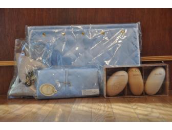 Gutzee's custom designed elegant feminine satin travel accessory set including (among other items) hanging toiletry bag and cosmetics bag