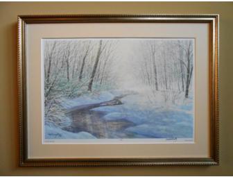 "New Year Morning"– a signed and numbered limited-edition lithograph of an original watercolor by Charles McCaughtry; beautifully custom-framed with non-reflective masterpiece glass; features muted colors which will go almost anywhere. Total dimensions: 18-1/2”(H) x 24-1/2”(W).