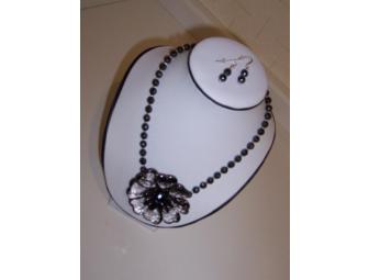 Faceted Hematite beads and silver spacers enhanced with a Joan Rivers flower pendant. Matching earrings included with sterling silver findings.
