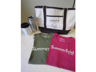 Check out this fun Summerfield Swag Bag! Our new canvas SWSF farm bag shows our a fun cow design and includes 2 T-shirts (a women's size medium & a men's size L), a ceramic travel mug & a steel travel mug.