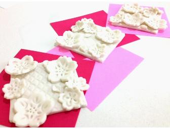 Set of three hand-made small white porcelain wall tiles with individually sculpted cherry blossoms by Laurel Lukaszewski