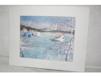 Color copy of original watercolor, depicting ice fishing shacks as glimpsed through birch trees on the shore. 8 by 10 picture, matted and ready for framing