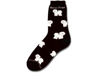 These fashionable socks featuring Bichon Frises are constructed using advanced technological engineering. Strategic placing of cushioned areas create comfort for the feet in all types of activities. Hi-Bulk acrylic yarns used throughout the sock wicks away perspiration, its natural anti-bacterial properties help inhibit the growth of bacteria and the stretch nylon woven into the sock ensures firm support and fit in the arch, ankle and heel. Fits Women's size 6-11 or Men's size 5-10. Contains less than 4% latex.