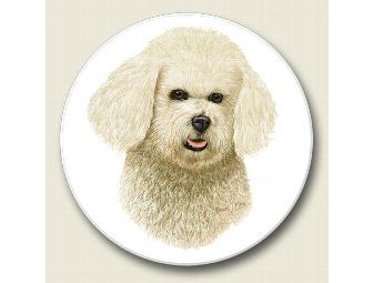Tired of the puddles in your automobile’s cup holder? If so, these decorative, absorbent auto coasters could be the answer to your problem! These 2.59” round absorbent ceramic tile auto coasters fit most standard size cup holders. They feature Bichon Frises by artist Robert May. The coasters can be easily cleaned with a touch of mild soap and a damp cloth. Air drying is recommended for best results. Set of 2.