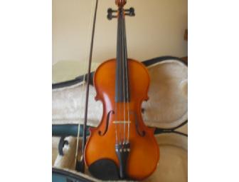 This beautiful, used full-size violin and bow in canvas-covered hard case is a nice instrument! Some cosmetic wear. Currently set up with viola strings, but can easily be changed to violin strings.