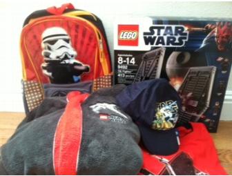 The perfect gift for the Jedi Knights in your life! This one of a kind package donated by Lucasfilm Ltd. includes a TIE Fighter 413 piece LEGO set, a plush hooded LEGO bathrobe (11-12yrs), Storm Tropper Backpack, X-Wing Fighter long sleeve tee (M) and Baseball Cap (3-6 yrs).