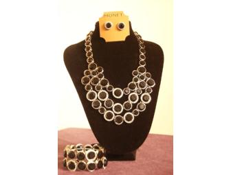 Monet 3-piece matching jewelry set: Stretch cord bracelet; 3-row necklace with extension chain and lobster clasp; stud earrings. The design is black faceted glass beads, some of which are surrounded by rings of diamantes.