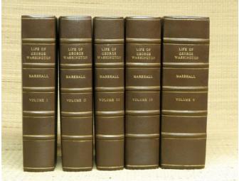 Marshall, John, Chief Justice of the United States, The Life of George Washington. London: Richard Phillips, 1804. John Marshall, Chief Justice of the United States, The Life of George Washington, Commander in Chief of the American Forces (during the war which established the independence of his country, and first President of The United States. Compiled under the inspection of the Hon. Bushrod Washington, from Original Papers bequeathed to him by his deceased Relative. To which is prefixed, an introduction, containing a compendious view of the colonies planted by the English on the continent of North America). London: Printed for Richard Phillips, No. 71, St. Paul's Church-yard, 1804. By T. Gillet, Salisbury-square. (May 26, 1804). In Five Volumes, complete with all maps and engravings. FIRST EDITION. FINE. Five volumes. xxxvi,579,[1]; viii,633,[3]; viii,570 [i.e. 572]; viii,684; viii,843,[5]pp., plus twelve folding maps and three plates bound in as frontispieces (two folding). One in-text illustration. Newly bound in dark brown morocco by a top bookbinder, 5 raised ridges, titles in gilt, rough-cut pages. Exquisite handmade marble endpapers in matching shades of brown, peacock pattern. A very handsome set, in fine condition. Octavo issue of the British edition which, according to Howes, is the best edition of Marshall's classic biography of Washington. "After the able, accurate and comprehensive work of Chief Justice Marshall, it would be presumptuous to attempt a historical biography of Washington" - ! Jared Sparks. The first American edition and this first British edition contain a history of the colonies in the first volume which was omitted from later editions. Howes calls for ten maps and six plates. This conforms to this copy and the list of maps and plates in the rear of the fifth volume, with one of the "plates" actually an in-text illustration on p.570 of the third volume. A quarto British edition was also produced at the same time. HOWES M317. SABIN 44788. The complete list of maps/engravings includes: 1. Portrait of Washington (frontispiece); 2. Map of the Northern Provinces of the United States (folding); 3. Map of the Southern Provinces of the United States (folding); 4. Mount Vernon, with Washington on horseback (folding); 5. The City of Washington (folding); 6. The Elm Tree under which Knox made his treaty (in-text engraving); 7. A Map of Part of Rhode Island (folding); 8. Plan of the country from Frogs Point to Cotton River (folding); 9. A Plan of New York Island (folding); 10. A map of the country from Raritan River in East Jersey (folding); 11. A map of those parts of Virginia, North Carolina and Georgia (folding); 12. A plan of the Northern part of New Jersey (folding); 13. The siege of Charleston (folding); 14. Boston and its environs (folding); 15. Investment and attack of York in Virginia (folding); 16. The scene of operations of the Northern Army (folding); Sporadic light foxing to a few of the engravings/maps, else surprisingly bright. A few very minor expert archival paper repairs. Slight scuff to one board. Investment quality. Fine.