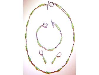 20" necklace with 4mm peridot crystals & sterling tubes. A 7.75" bracelet with the same crystals & tubes & earrings with leverback clasps. Necklace and bracelet have a 13mm sterling silver toggle clasp.