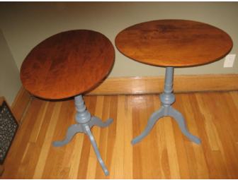 Two end tables, crafted by a Morey grandfather. Solid cherry tops finished in a rich stain over antique gray-painted base. Each table stands 28" high with an oval top dimension of 18"x24".