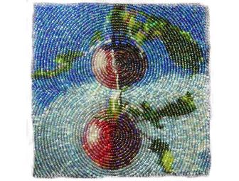 Stitching down tiny beads, I draw images from my everyday life and my dreams. Apples represent life—they are symbols of corporal sustenance, passion, and desire, as well as earthly connection.  They appear throughout mythology and folklore in such stories as Snow White, the Juniper Tree, and the myths of Eve, Persephone, Atalanta, Hesperides, and Helen of Troy.  In this piece, the apples hang in a balance of both light and shadow.