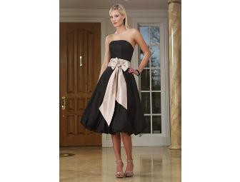 This gown features strapless neckline, natural waist with bow and sash. There is a natural waist along with an A-line tea length skirt.