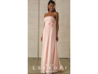 Spring 2011 Collection. Chiffon strapless gown with soft pleats. Ruched band at the natural waist with an off-center self flower accent. Soft center pleats accent the front and back of the gown.