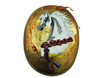 Ann Judge-Wegener, the trainer and rider for Thunder, the Denver Broncos mascot, created this mask. Ann carries the Stars and Stripes and rides Thunder on the field each time the Broncos score.