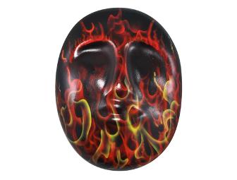 Colorado artist and firefighter Earle Chapman has been working in mixed media for over 40 years. His airbrushing has appeared on everything from textile and automotive to watercraft and aircraft. His mask reflects the fact that firefighters are most closely associated with fire and water. This mask represents the human element of loss to those forces.