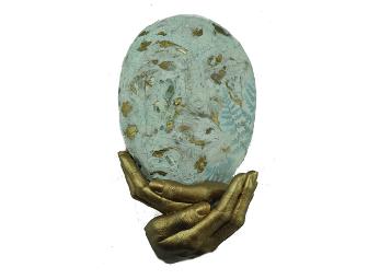 Agneiszka Gorska, an art therapist in The Denver Hospice Grief Center, created this mask as a reflection of her work with patients and grieving. In "Cradling the Broken Pieces" the hands were cast to represent the holding of grief and sorrow that The Grief Center offers families.
