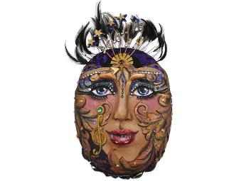 Terri Fisher has been creating entertainment experiences for clients for more than 15 years through her 5 Star Talent and Entertainment Inc. Her mask by local artist Liza Witiker, is titled, "Magical Penny from Heaven." Finding a "heads-up" penny after her dad died signified to her that he was OK. Following that experience Terri repeatedly ran into staff from The Denver Hospice and felt an important link since her dad died in their care. In memory of her dad, Terris mask is filled with shimmering gems and stones and- a reminder of her sparkling experiences with her dad.